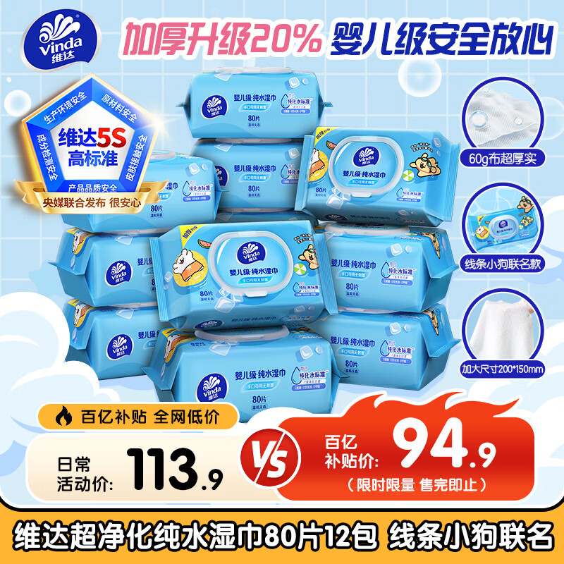 自营维达(Vinda)超净化纯水湿巾 80片*12包 线条小狗联名 婴儿湿巾手口可用湿纸巾