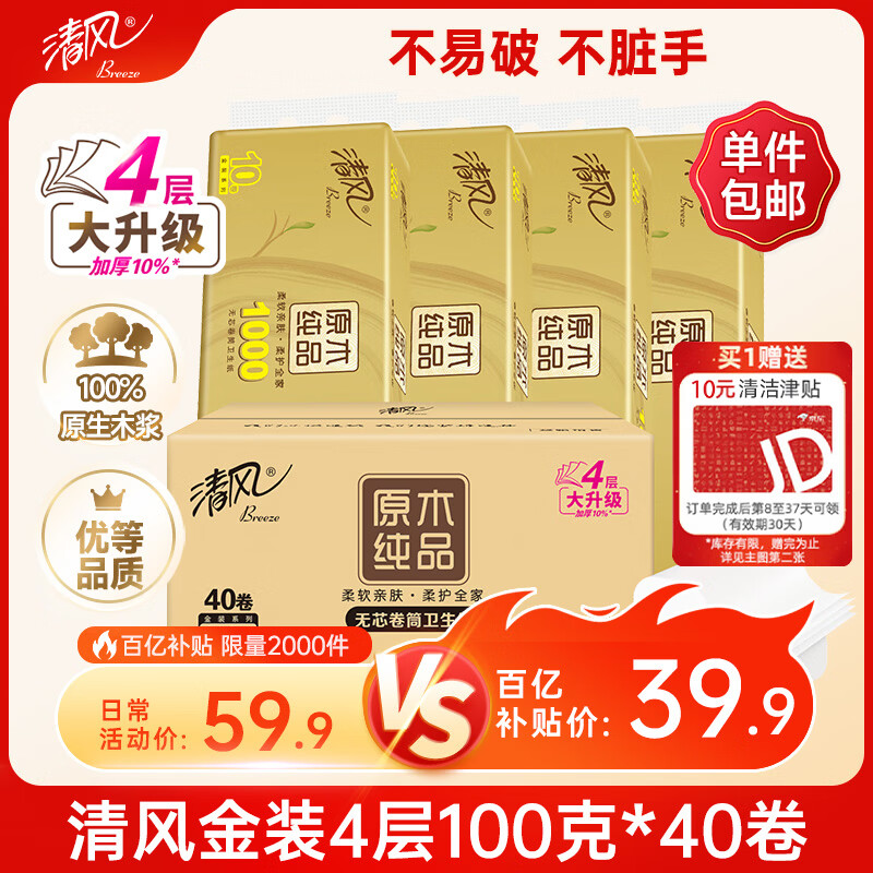 自营清风无芯卷纸 原木金装 4层100克*40卷 卫生纸卷纸纸巾整箱 m码厕纸