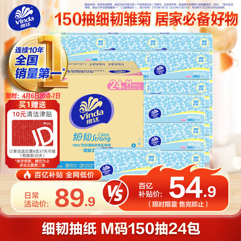 自营维达(Vinda)抽纸【孙颖莎推荐】棉韧3层100抽*24包S码 亲肤无刺激纸巾 AB混发