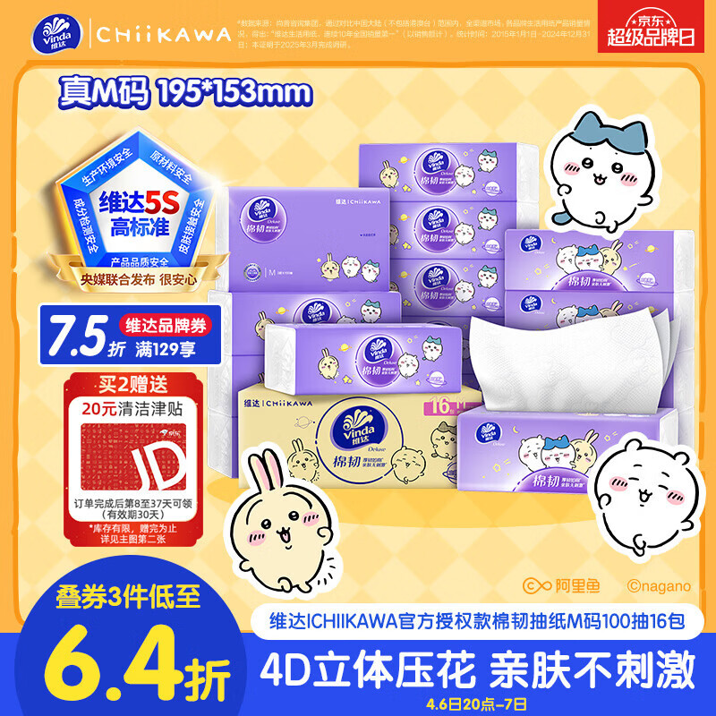 自营维达(Vinda)|CHIIKAWA 抽纸 棉韧3层100抽*16包M码 卫生纸纸抽 纸巾 整箱