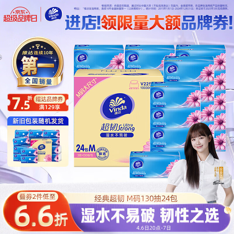 自营维达(Vinda)抽纸 【孙颖莎推荐】超韧3层130抽*24包M码 新旧随机 整箱