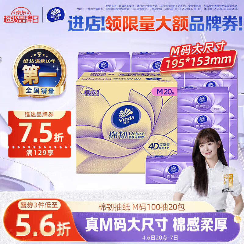 自营维达(Vinda)抽纸 棉韧3层100抽*20包M码 卫生纸纸抽 纸巾 整箱