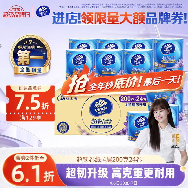 自营维达(Vinda)有芯卷纸【孙颖莎推荐】超韧4层200克*24卷 高克重卫生纸厕纸整箱