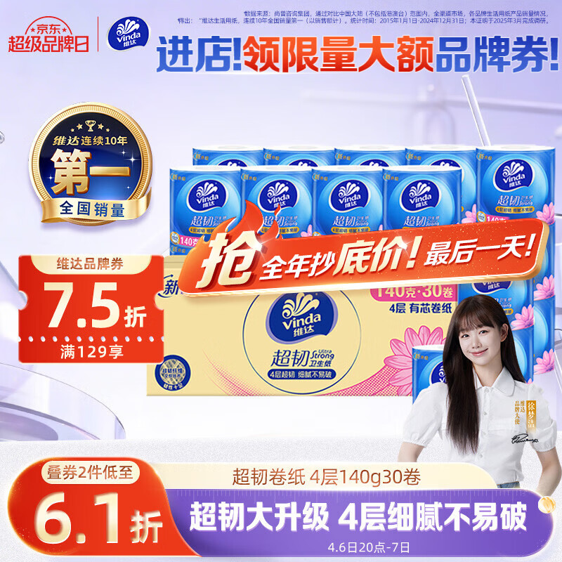 自营维达(Vinda)有芯卷纸【孙颖莎推荐】棉韧4层140节*30卷 亲肤无刺激卫生纸整箱