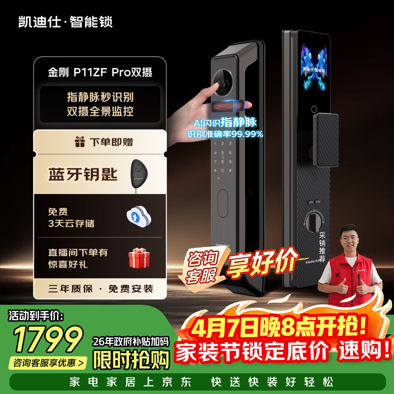 自营凯迪仕(KAADAS)智能门锁人脸识别猫眼可视大屏指静脉上门安装P11ZF Pro双摄