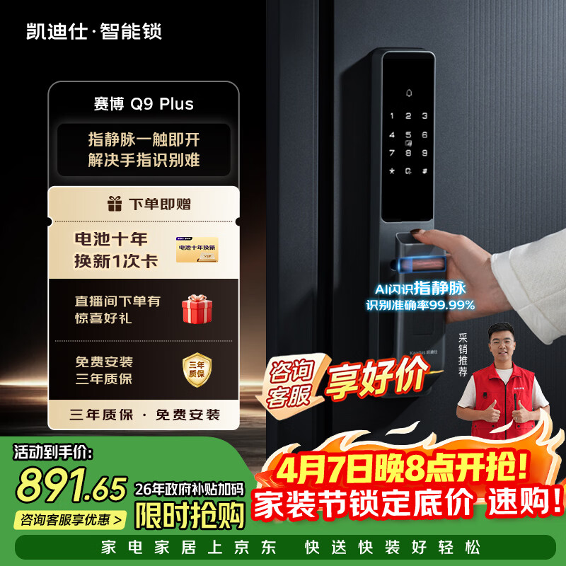 自营凯迪仕(KAADAS)智能门锁 指静脉指纹识别 智能锁 电子锁密码锁 赛博Q9 Plus