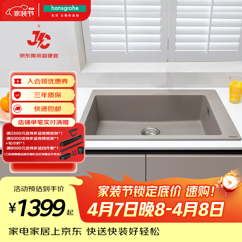自营汉斯格雅(Hansgrohe)【顶奢款】厨房水槽石英石槽台上安装单槽含手动下水
