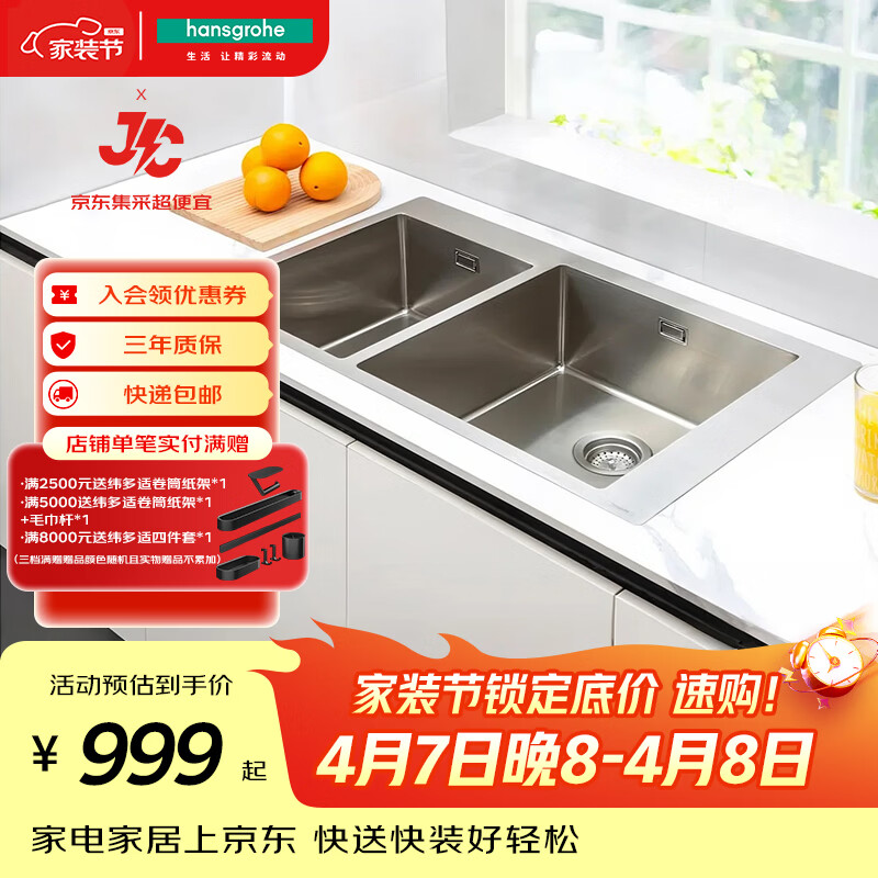 自营汉斯格雅(Hansgrohe)厨房水槽304不锈钢双槽台上安装普通水槽