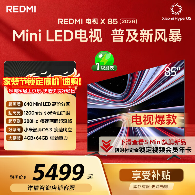 自营小米(MI) REDMI电视X 2026款 85英寸 Mini LED288Hz 1200nits 4GB+64GB平板电视L85RC-RX