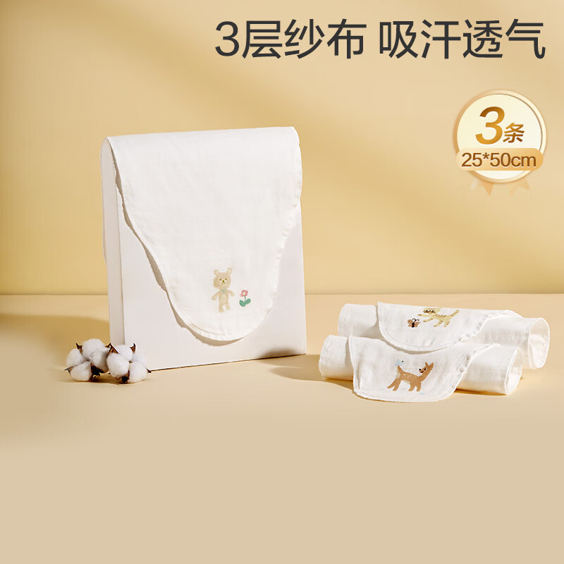 自营全棉时代婴儿隔汗巾纱布吸汗儿童宝宝开学幼儿园纯棉垫背小熊小鹿小猫3条