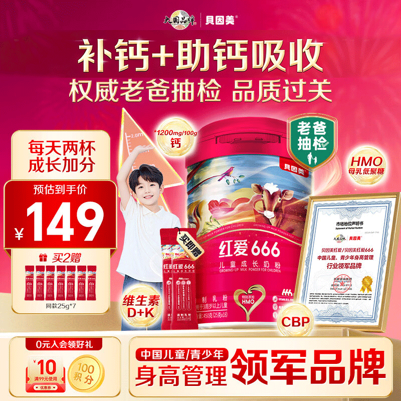 自营贝因美【老爸抽检】红爱666儿童成长奶粉450g 3-15岁含HMO+CBP