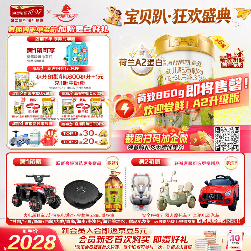 自营海普诺凯1897荷致A2蛋白*奶源版幼儿奶粉3段(12-36月)800g*6罐【顶奢升级】