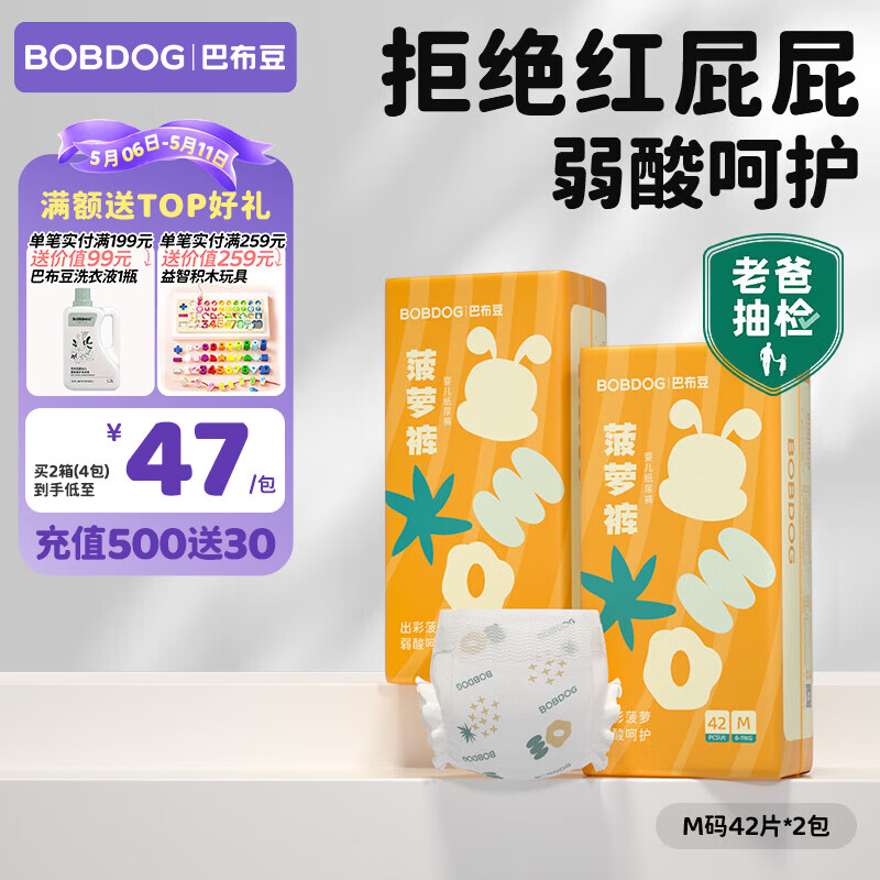 旗舰店巴布豆(BOBDOG)新菠萝拉拉裤超薄透气尿不湿纸尿裤婴儿试用夜用动感贴合植萃弱酸 纸尿裤M 84片【9-17斤】