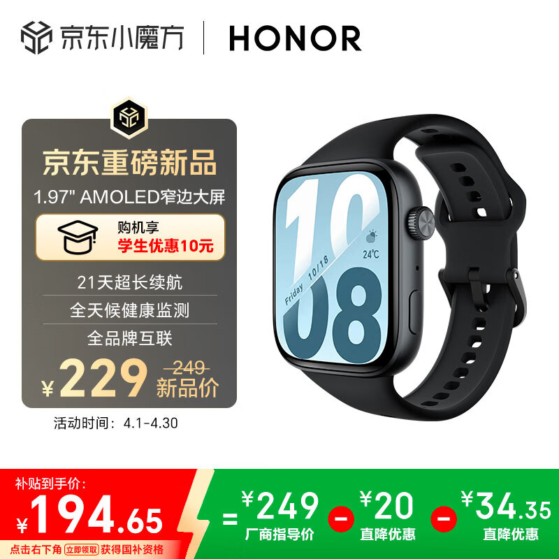 自营荣耀手表X5i【国家补贴】幻夜黑 智能手表 OLED窄边大屏 21天超长续航 全天候健康监测 双向蓝牙通话