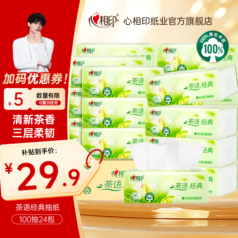 百亿补贴心相印抽纸茶语纸巾面巾纸餐巾纸擦手纸卫生纸家用整箱 3层 100抽*24包 【茶语经典】