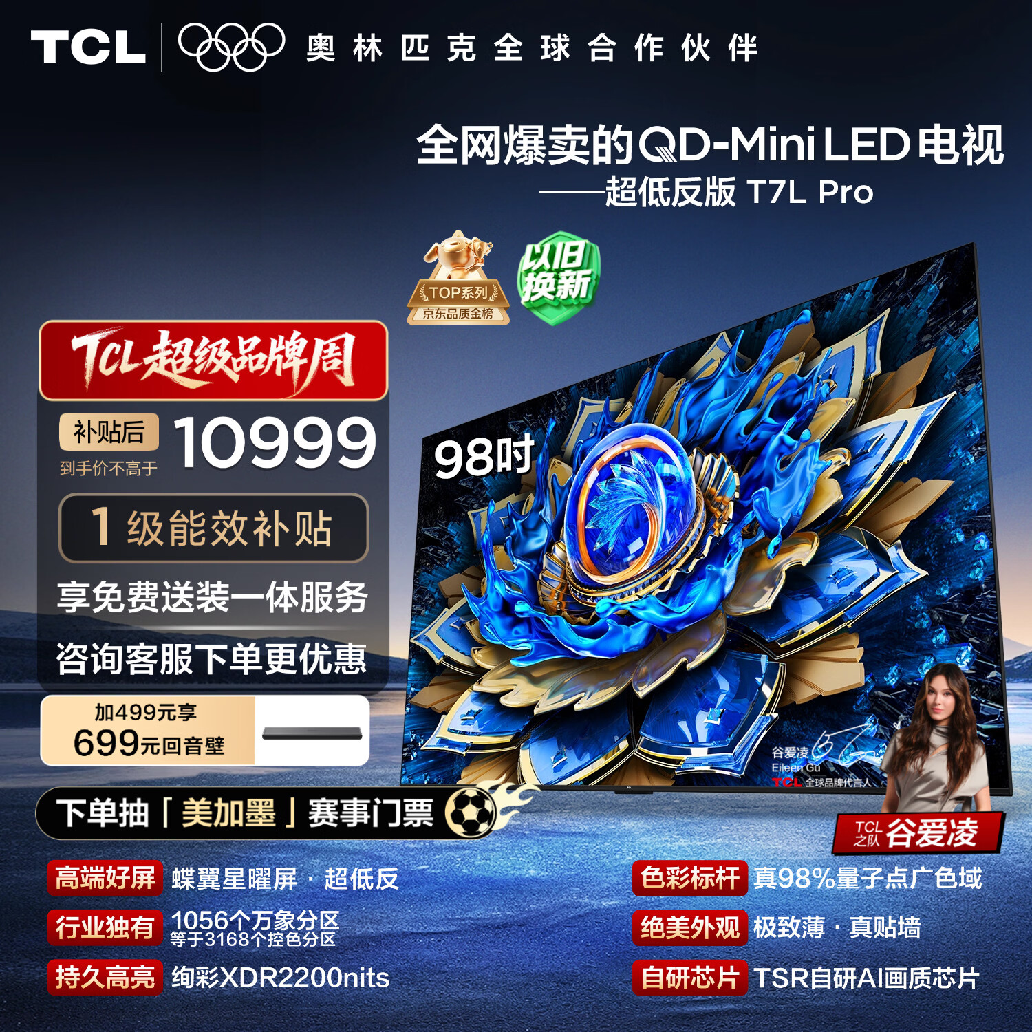 自营TCL电视 98T7L Pro 98英寸 QD-Mini LED 蝶翼星曜屏 万象分区 绚彩XDR 98/100英 国家补贴 护眼