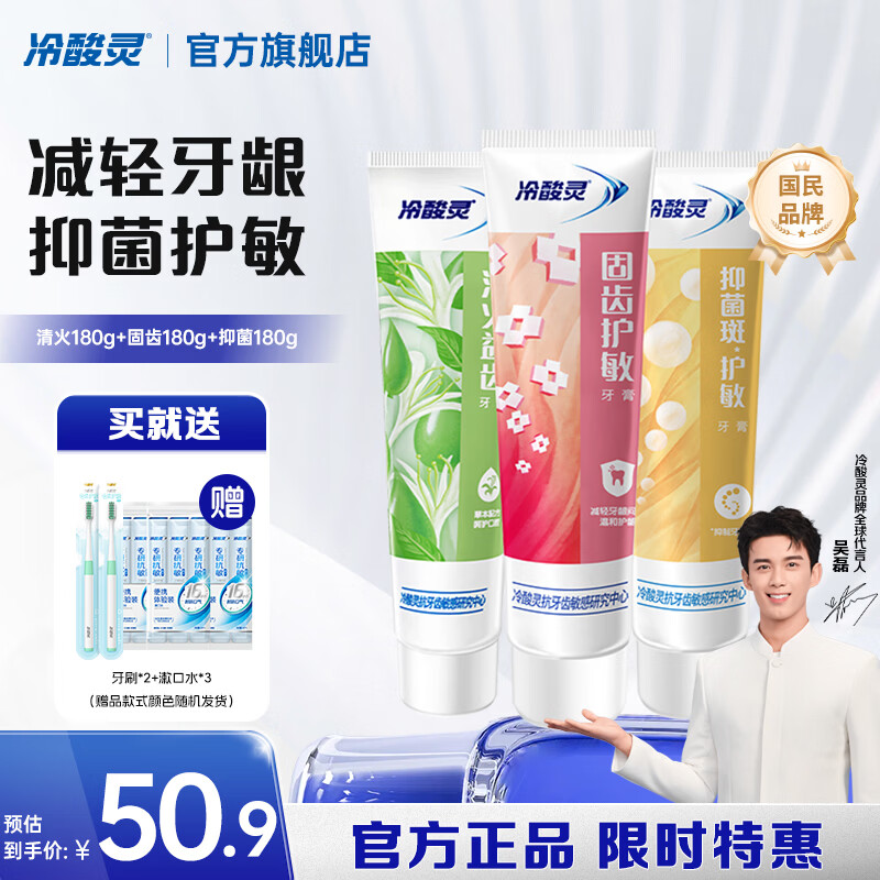 旗舰店冷酸灵量贩家庭装多效合一缓解敏感清新口气抗敏牙膏 清火+固齿+抑菌套装 180g 3支