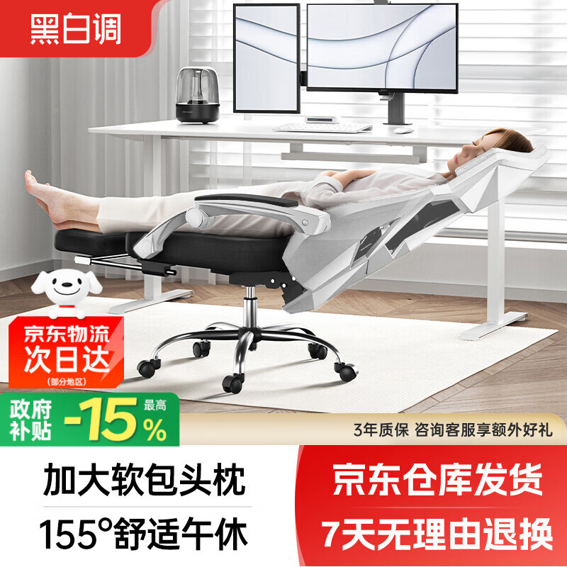 黑白调P4 Pro人体工学电脑椅子办公椅可躺午休椅 霜白色(带脚托可躺)