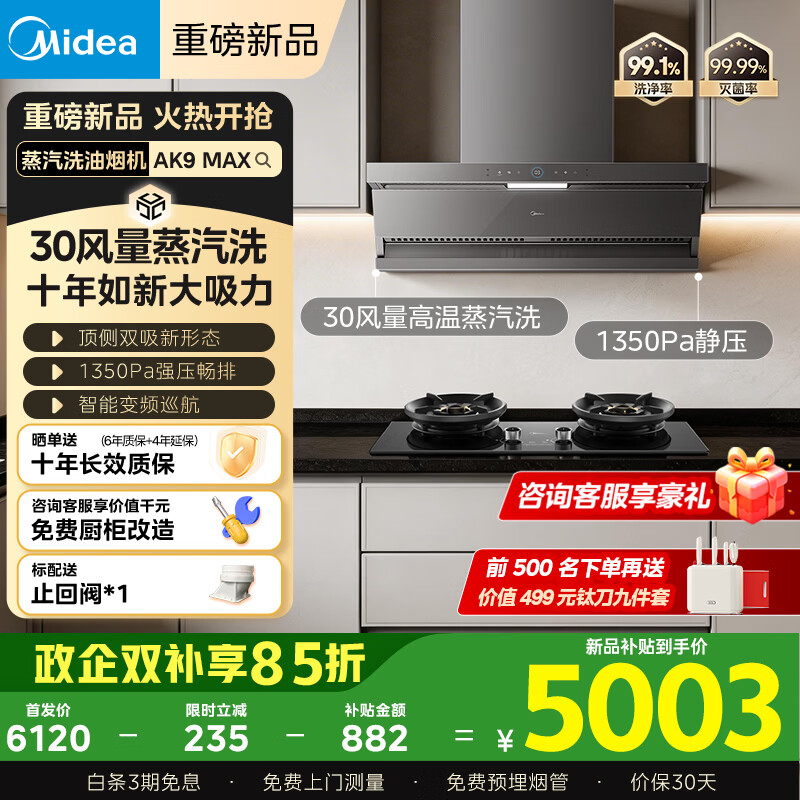 自营美的(Midea)【蒸汽洗AK7 Max升级版】抽吸排油烟机30风量顶侧双吸变频5.2kW 猛火灶AK9 MAX+AK7 液化气套装