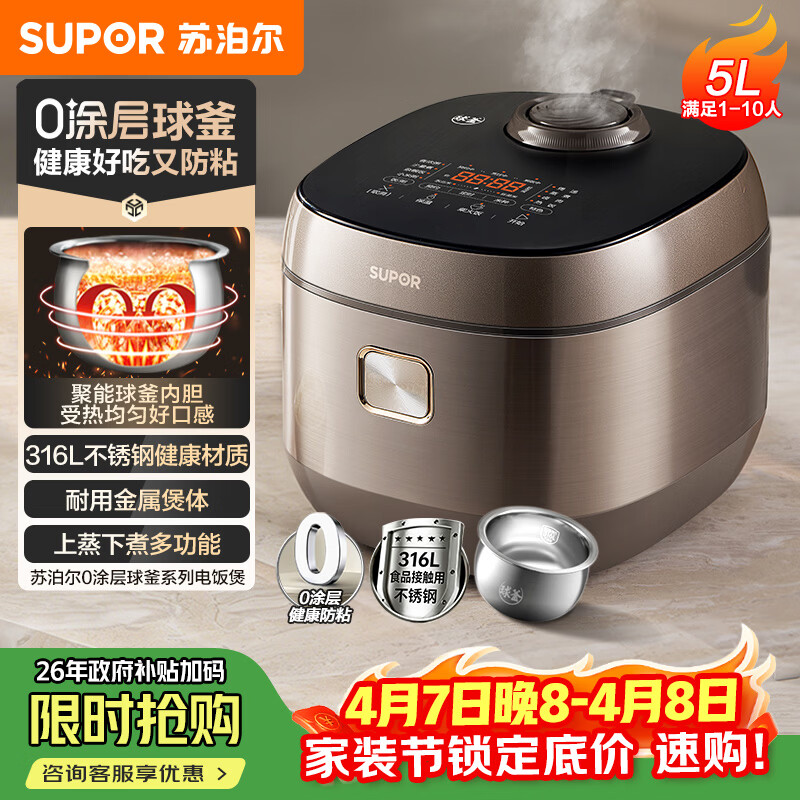 自营苏泊尔(SUPOR)电饭煲0涂层不锈钢球釜多功能防溢微压家用5-8人大容量5L智能预约电饭锅F50F79S