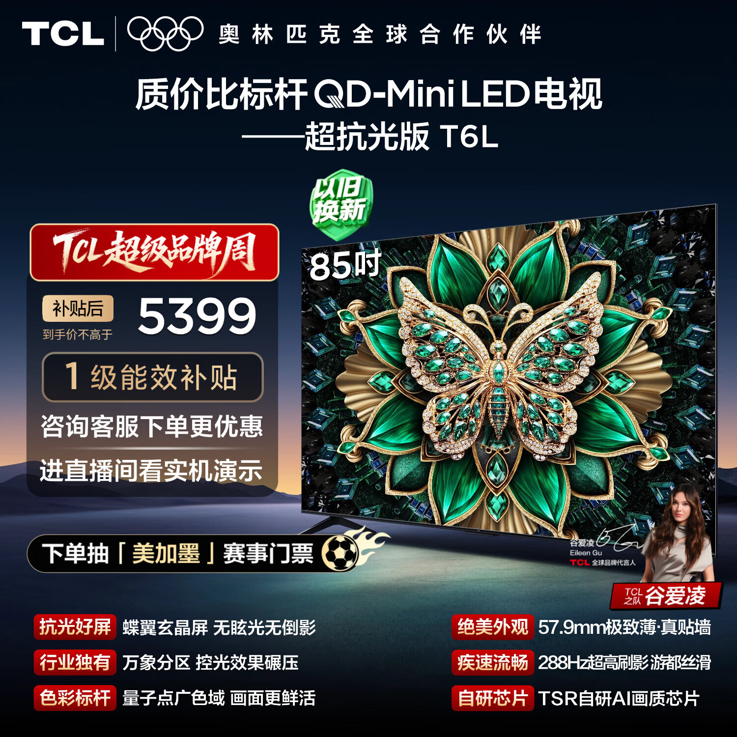 自营TCL电视 85T6L 85英寸 QD-Mini LED 万象分区 量子点 抗反光防眩光 DeepSeek AI电视 国家补贴