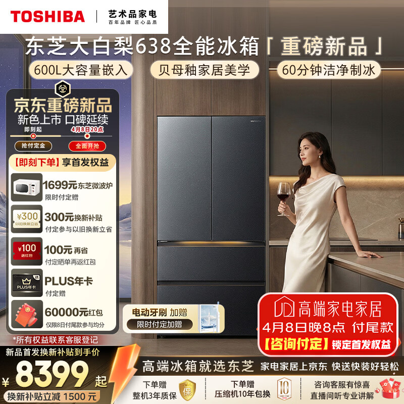 自营东芝(TOSHIBA)大白梨黑金版600L法式多门冰箱638双系统制冰超薄零嵌入超大容量家用变频GR-RF638WI-PM1
