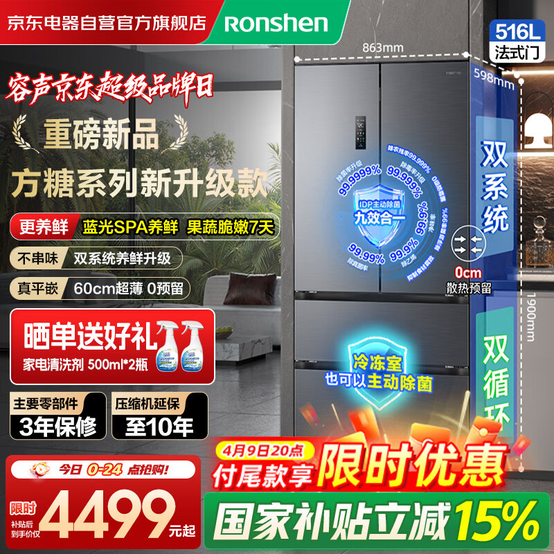 自营容声方糖升级516L主动双净双系统双循环家用电冰箱法式多门超薄嵌入式一级能效BCD-516P60FZMAE世界杯