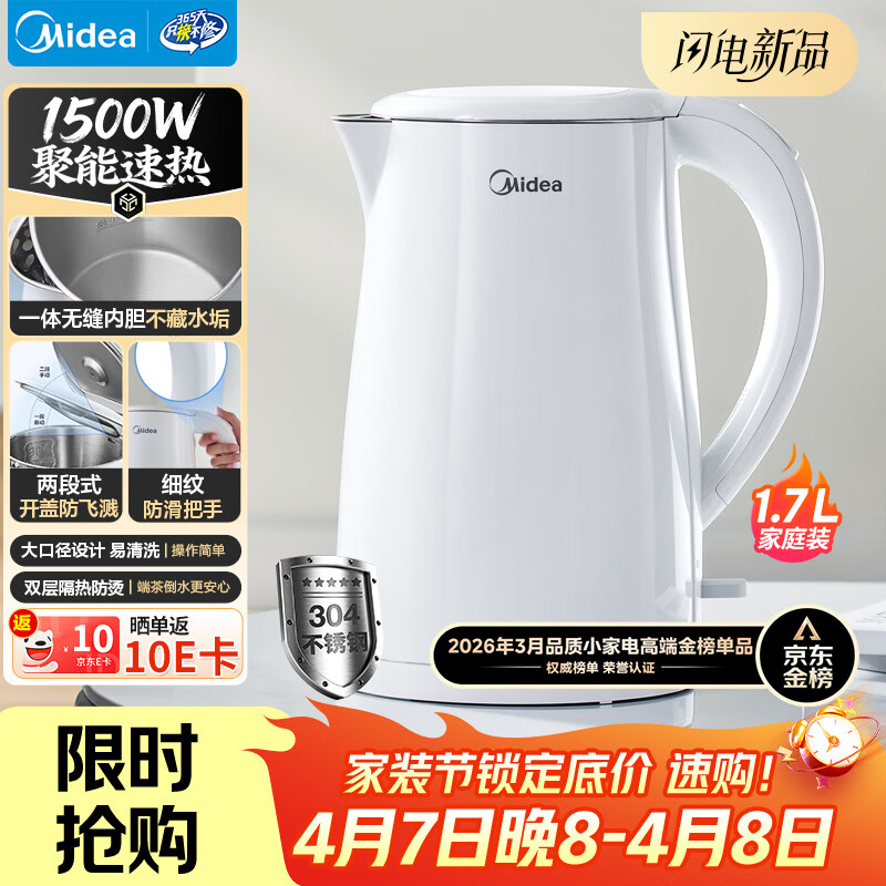 自营美的(Midea)电热水壶烧水壶1.7L304不锈钢0涂层双层隔热自动断电1500W养生冲奶泡茶 MK-SH17M130