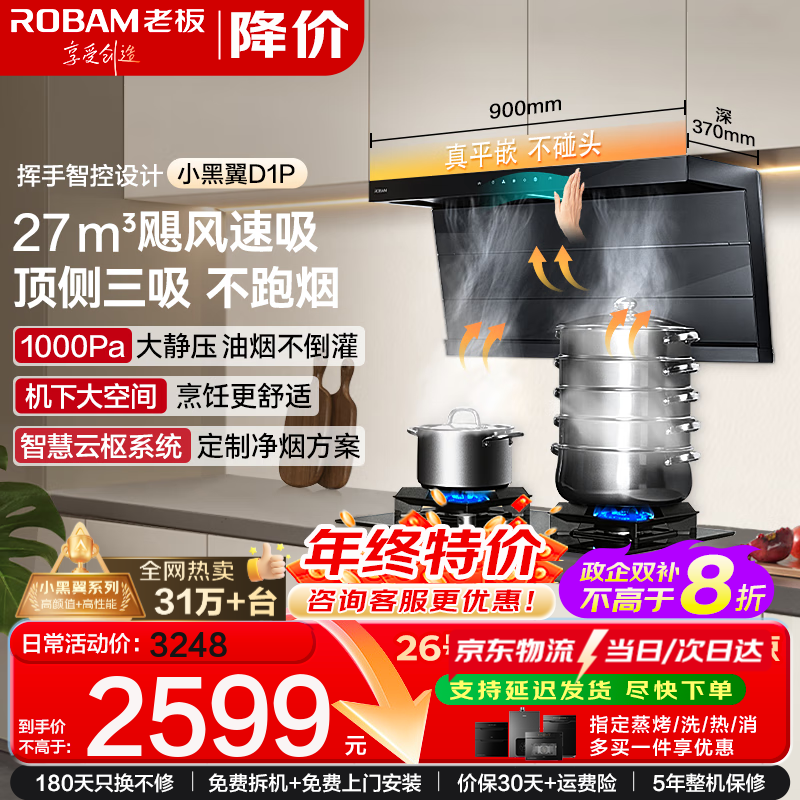 旗舰店老板(Robam)油烟机【小黑翼D1P抽油烟机】27立方大吸力顶侧双吸油烟机燃气灶套装一级能效 【单烟机】国家补贴20%