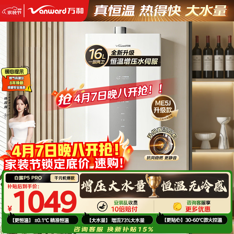 自营万和白露【水伺服P5 16L】热销爆款 天然气 增压直流变频恒温静音节能超薄一厨两卫16P5 PRO燃气热水器