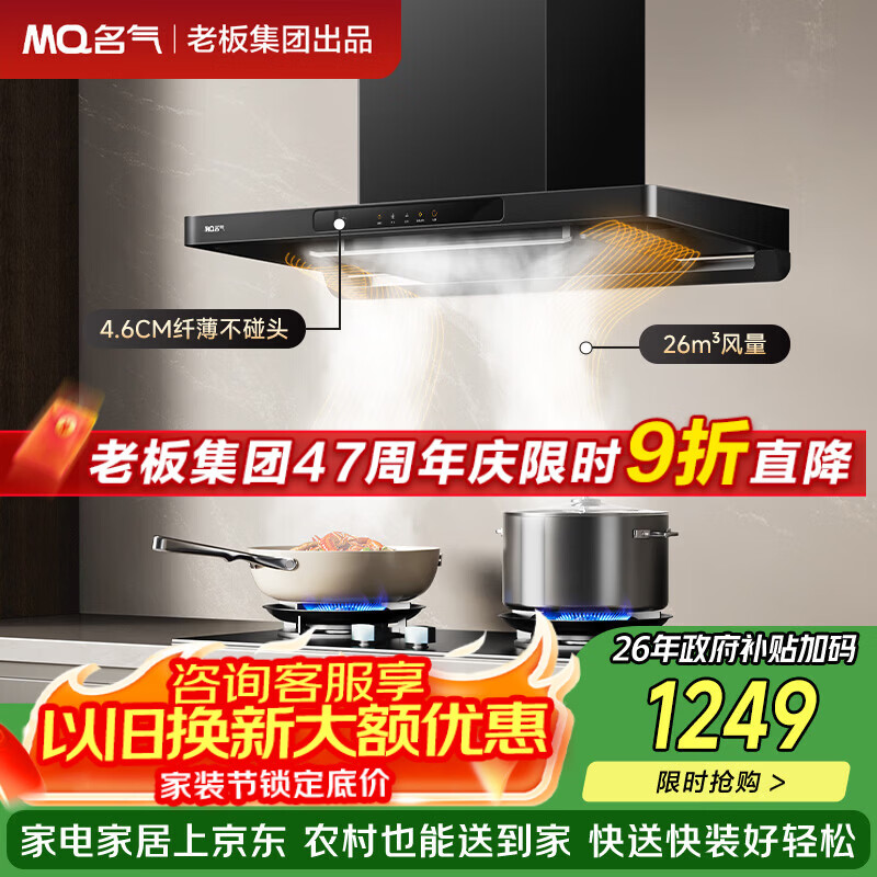 自营名气(MQ)老板出品纤薄欧式双子星顶吸式抽吸排油烟机26风量家用大吸力吸烟机1200pa以旧换新Q10搭配燃气灶