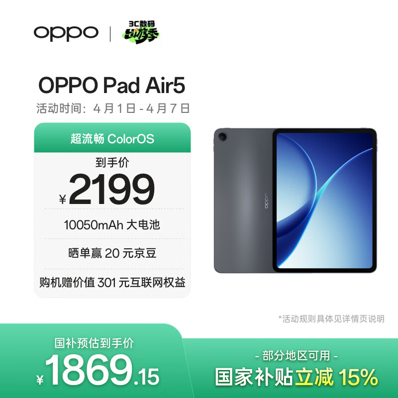 自营OPPO Pad Air5 国家补贴 12.1英寸平板电脑 超流畅ColorOS 8GB+256GB 深空灰 办公学习游戏娱乐平板