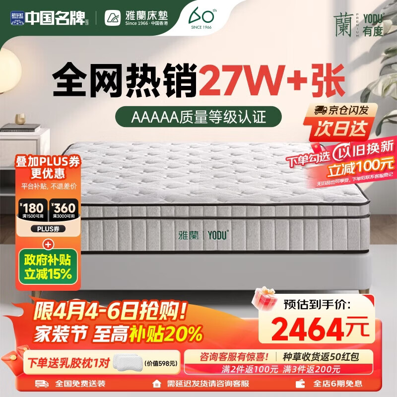 自营雅兰 有度·旗舰版3.0 高纯乳胶独袋弹簧床垫舒脊黄麻床垫1.8x2米偏硬