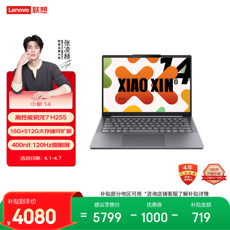自营联想笔记本电脑小新14高能本 锐龙7 H255 16G 512G 400nit 120Hz高刷高色域 轻薄办公学生 国家补贴